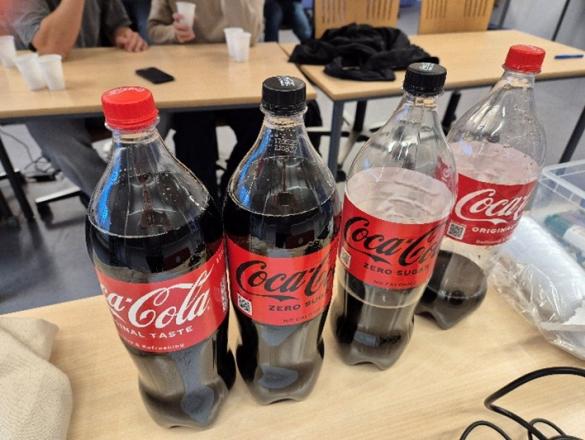 På matematik A-holdet var der cola-smagning. Kan man smage forskel på Coca Cola med sukker og den uden? Denne tese blev afprøvet ved at lave smagstest. 16 ud af 20 elever kunne gætte/smage forskel, men kan vi så drage konklusionen at det kan de? Hvad tror du?