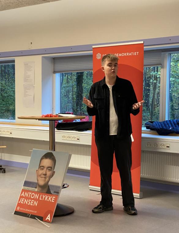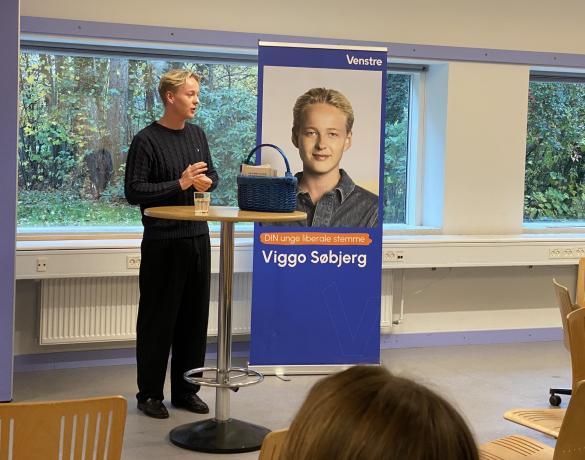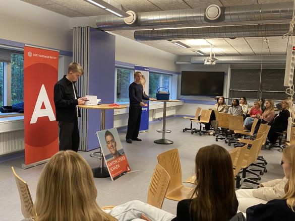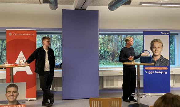 De to yngste kommunalvalgskandidater, Anton Lykke Jensen (S) og Viggo Sjøberg (V), besøgte i dag gymnasiet for en kort debat med eleverne. Samfundsfagslærerne havde på forhånd bedt dem om at forholde sig til et par emner, men ellers var der rig mulighed for at eleverne kunne stille spørgsmål til de to tidligere FVGH-elever, som nu er gået ind i politik. Det var en rigtig god mulighed for vores elever at møde andre unge i politik.