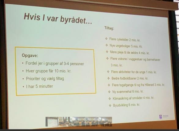 2z var den 17. december på Rådhuset som led et forløb i samfundsfag om kommunalvalg og velfærd. De blev først vist rundt blandt administrationen, og så gav borgmester Steffen Jensen et oplæg i byrådssalen om kommunens opgaver og byrådet. Eleverne blev delt op i 6 fantasifulde politiske partier blandt andet det røde nisseparti. De debatterede derefter og vedtog et fiktivt kommunalbudget på 10 millioner kr. Efter en intens debat styret af borgmesteren, hvor eleverne fik brugt mikrofonerne i salen, blev de enige om et kompromis, som det også sker i virkeligheden. Elevernes budget kom til at indeholde 6 millioner kroner til byudvikling men med en parentes om, at der også skal være aktiviteter til de unge. Derudover blev der givet 3 millioner til flere voksne i børnehaver og vuggestuer. Den sidste million gik til at starte med at give mere pleje til de ældre for at tilgodese de partier, der havde prioriteret den post. Besøget gav et levende indblik i byrådsarbejdet og det lokale demokrati, som eleverne satte stor pris på.